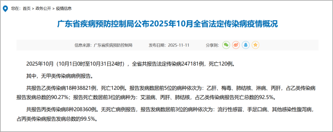 据广东省疾控消息,2025年10月(10月1日0时至10月31日24时),全省共报告法定传染病247181例,死亡120例。其中,共报告丙类传染病8种208360例。无死亡病例报告,报告发病数居前3位的病种依次为:流行性感冒、手足口病、其他感染性腹泻病,占丙类传染病报告发病总数的99.5%。其中,流行性感冒共报告121149例。