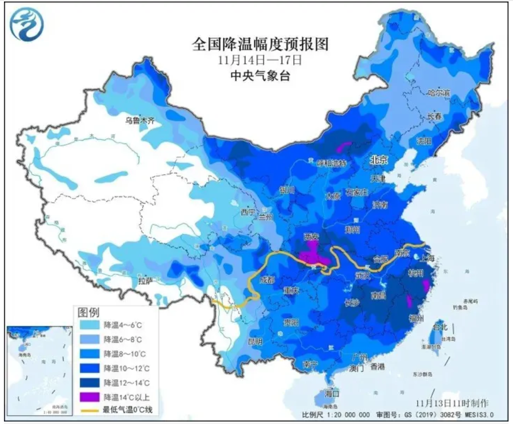 11月15日起,中东部大部地区将出现降温,部分地区降温可超12℃。17日至18日,南北方将迎来本次降温过程的气温低点,最高气温20℃线将退至华南沿海,最低气温0℃线将南压至江淮一带。多个城市将在这次降温过程迎今年下半年来最冷白天。