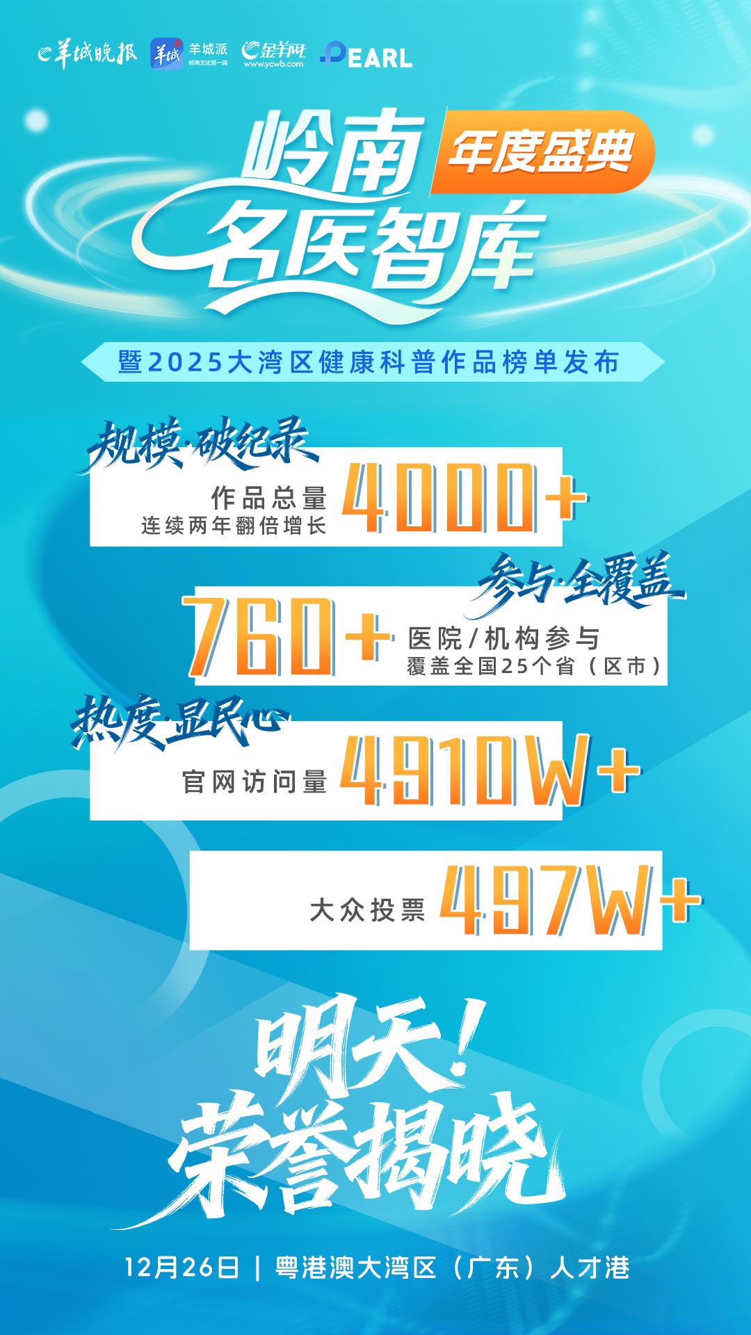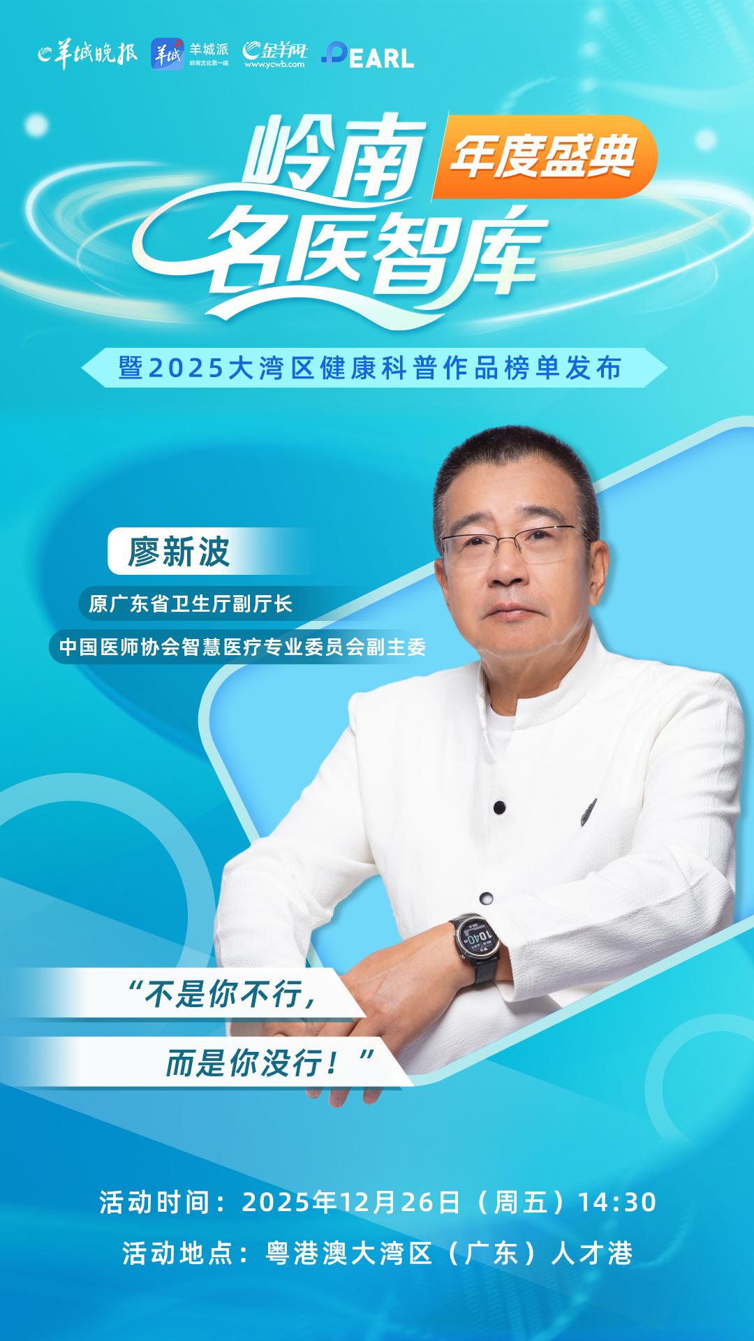 12月26日,由羊城晚报报业集团(羊城晚报社)、广东省基层医药学会、广东省护士协会共同举办的岭南名医智库年度盛典暨2025大湾区健康科普作品榜单发布,将在粤港澳大湾区(广东)人才港隆重举行,活动旨在构建医媒协同、多方联动的健康传播新生态,展现大湾区健康科普成果。