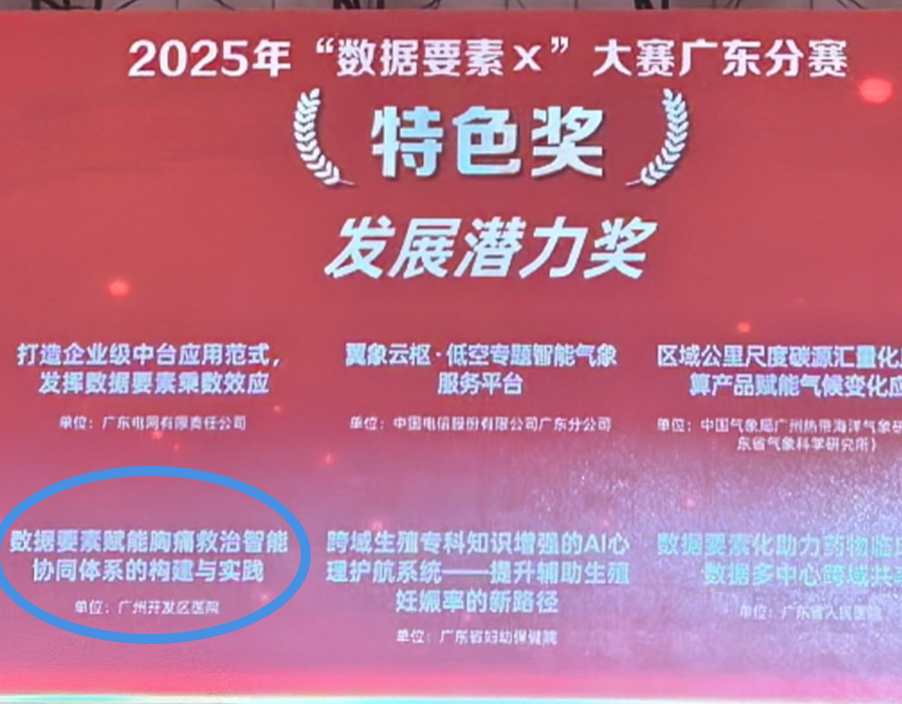 近日,2025年“数据要素×”大赛广东分赛颁奖仪式暨誓师大会在东莞落幕。经过4个月的激烈角逐,广州开发区医院申报项目“数据要素赋能胸痛救治智协同体系的构建与实践”荣获大赛“发展潜力奖”。
